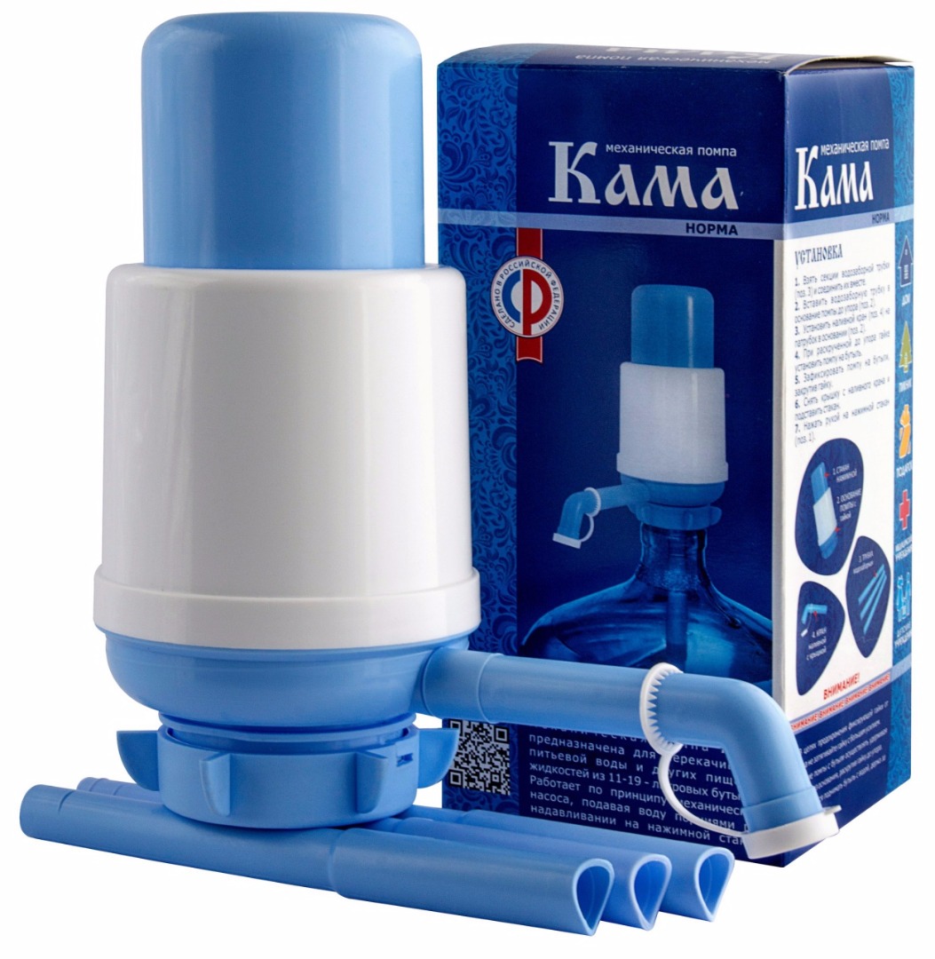 Механическая помпа для питьевой воды Кама Норма, российского производства.Помпа для воды- это приспособление для крепления на горловине бутылки и предназначенное для быстрого выкачивания жидкости из бутыли. Проще говоря, это насос, заметно облегчающий жизнь человека. При этом помпа должна содержаться в чистоте при ненадобности, а использоваться только в стерильном состоянии.