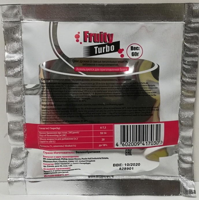Примечание: этот продукт также можно использовать для ферментации чистого сахара или дектрозы (максимум 6 кг), но наилучшие результаты достигаются при использовании фруктов или смеси фруктов и сахара (не более 7,5 кг ферментируемых сахаров). При использовании фруктов могут потребоваться энзим и пектиназы для осветления браги и удаления пенообразующего пектина в том случае, если Вы планируете употреблять брагу без дистилляции.