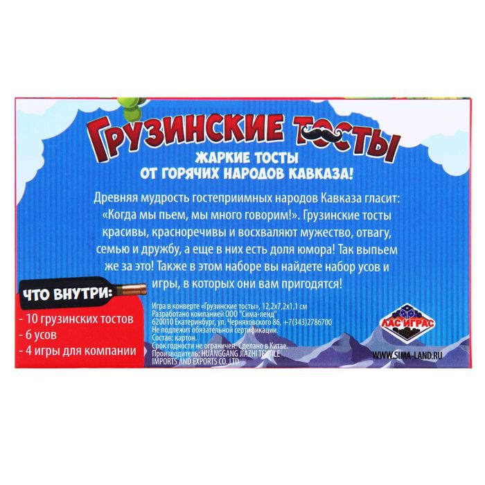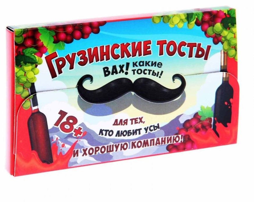 … сидели жители Кавказа и придумывали тосты. А мы собрали в этом наборе самые лучшие из их творений! Каждый тост написан на отдельном листочке. Их очень удобно брать с собой на любой праздник. Но это ещё не всё. Мы приготовили для вас 6 роскошных усов! Уж чем-чем, а усами грузины славятся. Также в конверте вы найдёте 4 игры для весёлой компании, в которых эти усы вам пригодятся. Бонус! Всех желающих ждут грузинские анекдоты внутри конверта!