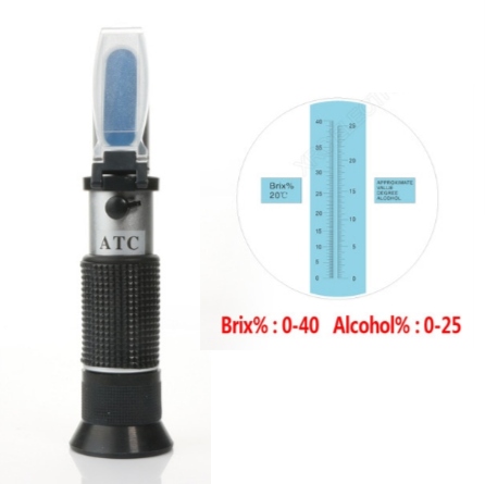 Рефрактометр нужен для определения концентрации сахара в растворе в диапазоне от 0 до 40% Brix, а также определения процентного содержания алкоголя в диапазоне 0-25%. Для того чтобы произвести измерения необходимо нанести несколько капель раствора на синюю призму рефрактометра, накрыть ее защитным стеклом и, направив призму на свет, посмотреть в окуляр на шкалу (горизонтальная граница между синей и белой зонами и будет искомым значением). Изображение шкалы может быть нечетким, чтобы это исправить нужно вращать окуляр. Во время измерения важно следить, чтобы исследуемый раствор полностью растекался по призме рефрактометра. После проведения измерения призму и защитное стекло рефрактометра нужно сразу очистить от остатков раствора.