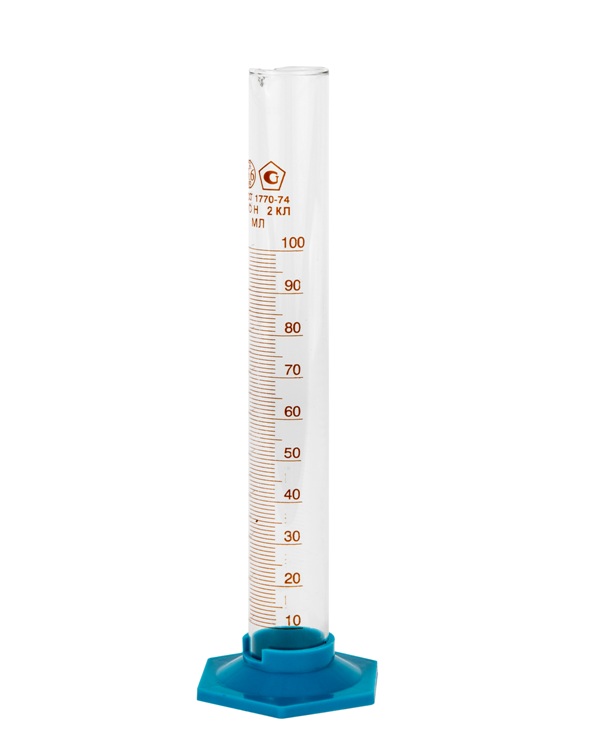 Стеклянный мерный цилиндр на пластиковом основании объемом 100 мл, широко используемый в лабораториях по всему миру.