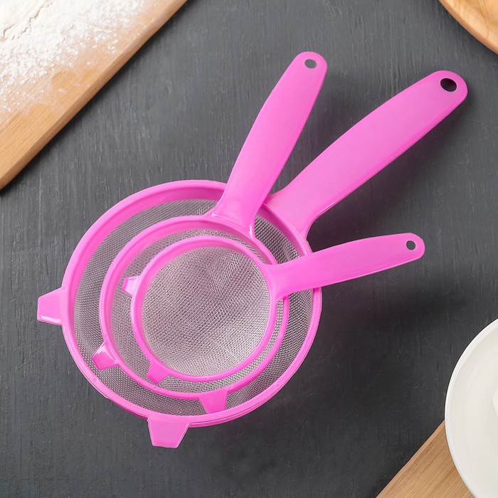 Набор сит, 3 шт, диаметром 6,5; 8 и 12 см, цвет микс. Сито — предмет посуды, необходимый в каждой кухне. Именно тщательное просеивание сыпучих ингредиентов позволяет добиться превосходного результата. Сито чаще всего используется для просеивания муки, какао-порошка, сахарной пудры и других мелкодисперсных по своему составу продуктов.