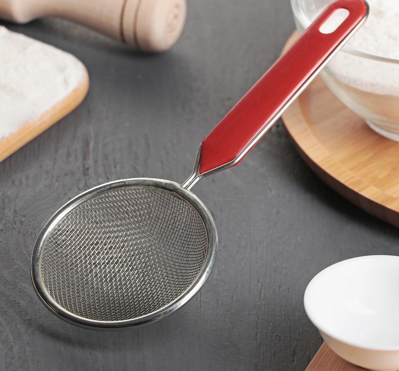 Ситечко универсально: его можно использовать как кухонный инструмент не только для муки, но и для процеживания жидкости или создания текстур при взбивании воздушных кремов и соусов.