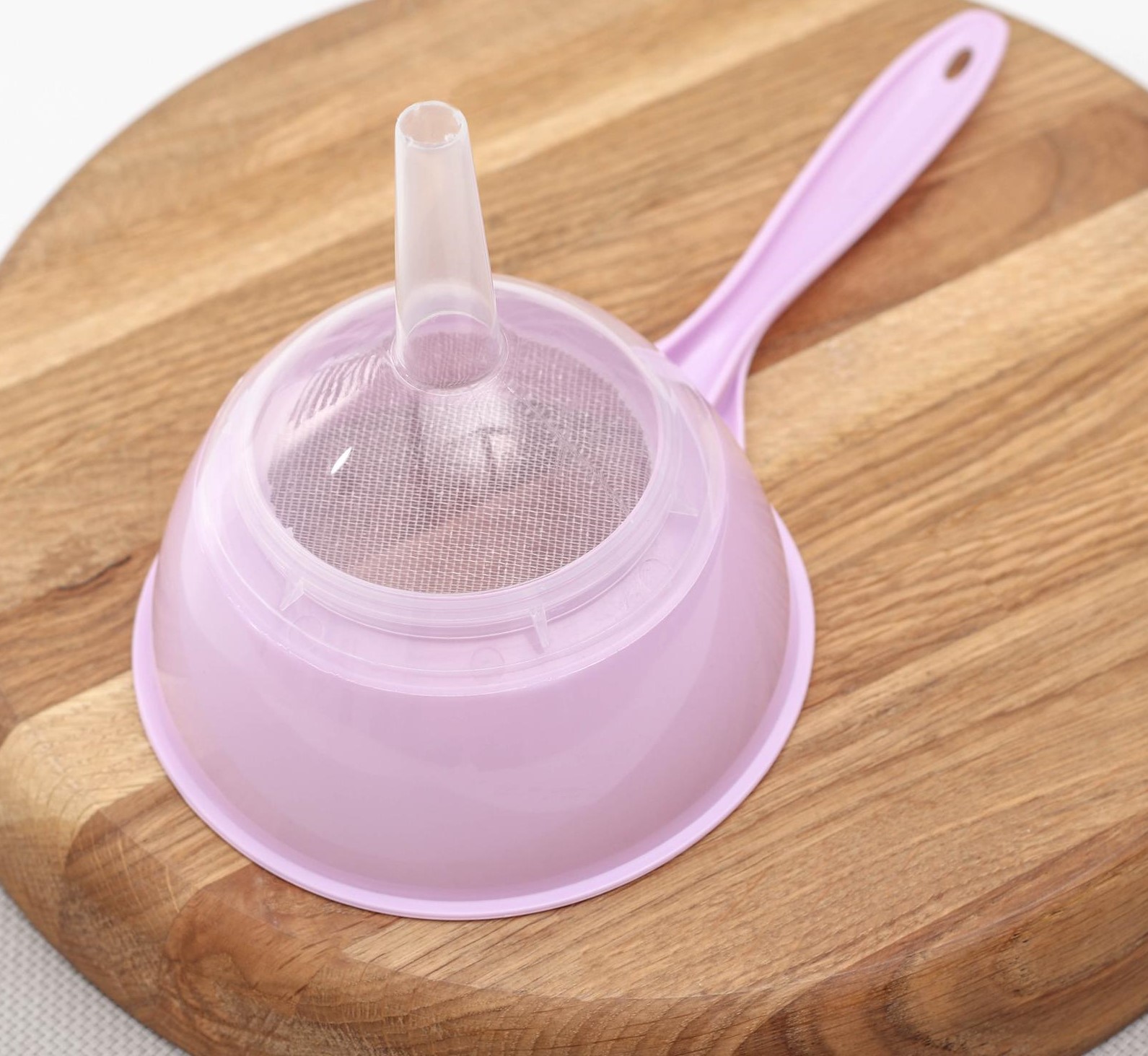 Воронка очень удобная и достаточно широкая. Состоит из двух частей: сито и воронка. Воронка присоединяется к ситу с помощью резьбы. Очень удобна для переливания жидкостей с осадком. Воронка является одним из незаменимых аксессуаров на вашей кухне. Она позволит аккуратно перелить жидкость или пересыпать мелкозернистые продукты в нужную ёмкость.
