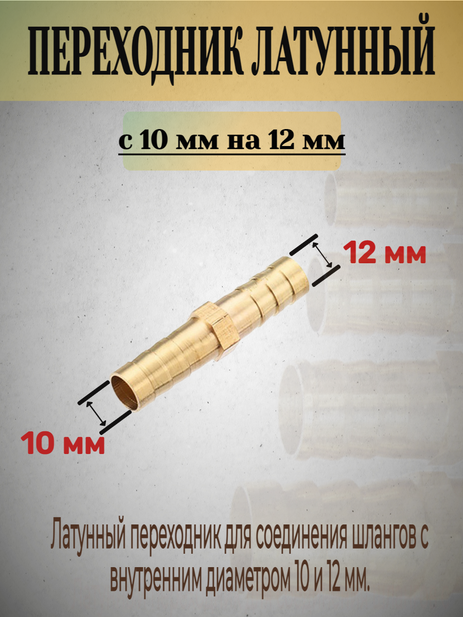 Переходник латунный с 10 мм на 12 мм - из себя представляет латунную трубку, с двух сторон штуцер елочка с наружным диаметром 10 мм и 12 мм, для присоединения всех видов шлангов под диаметр штуцера.