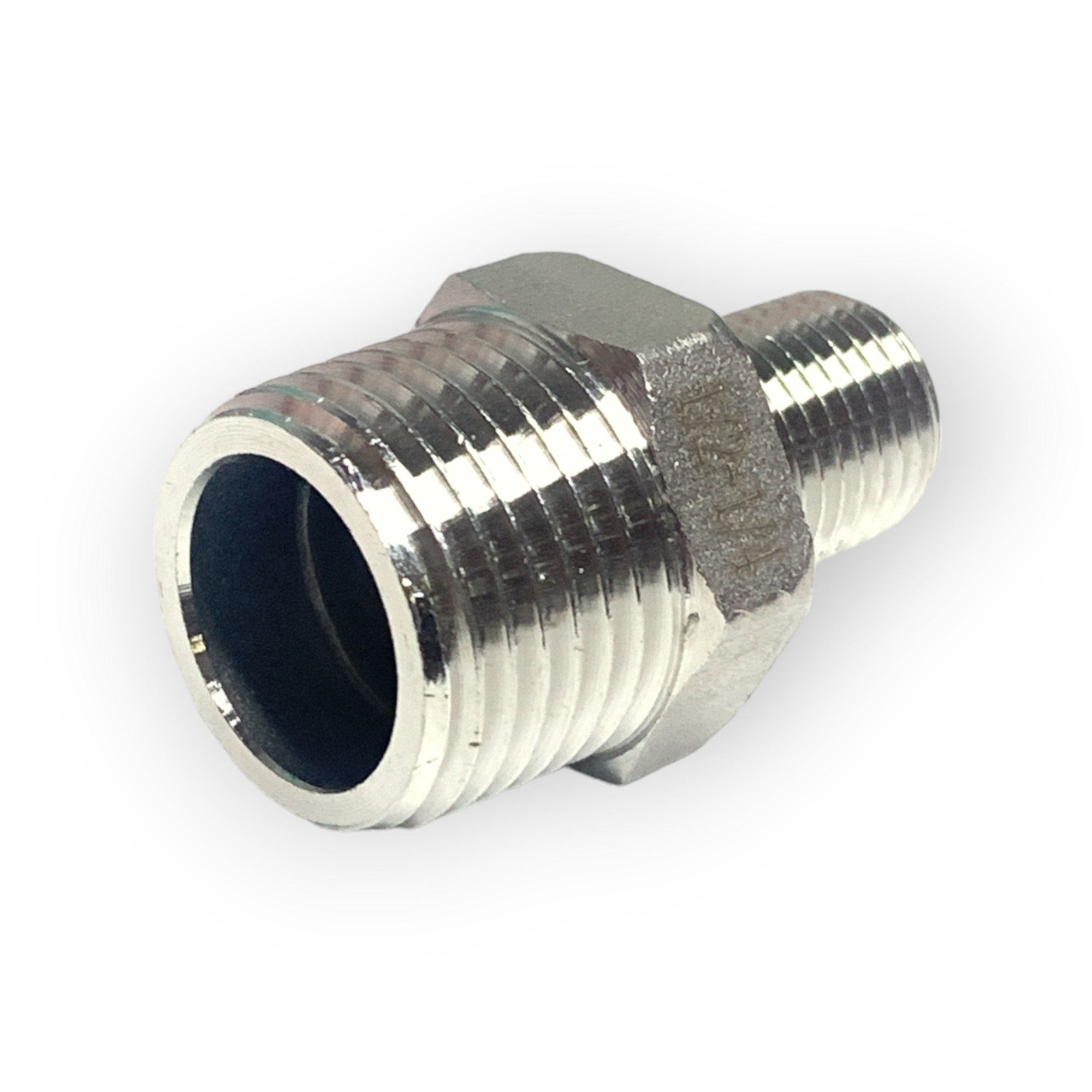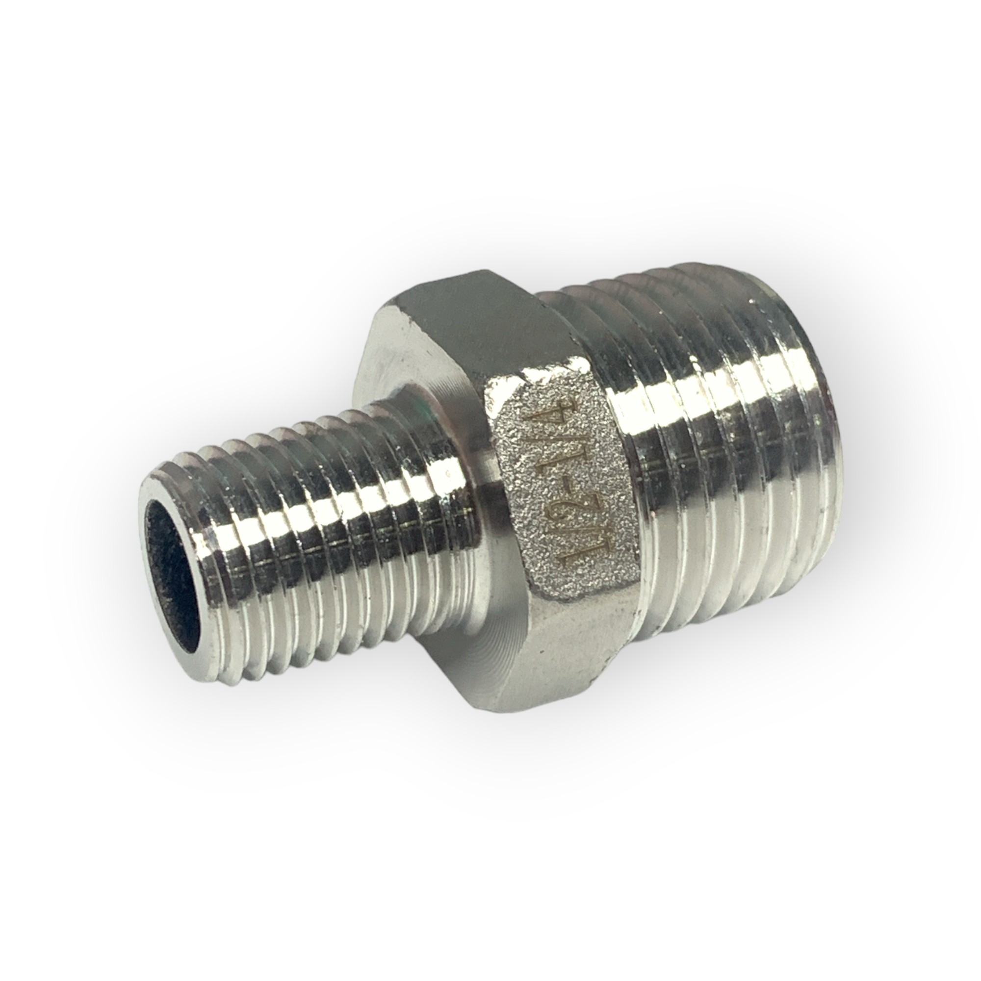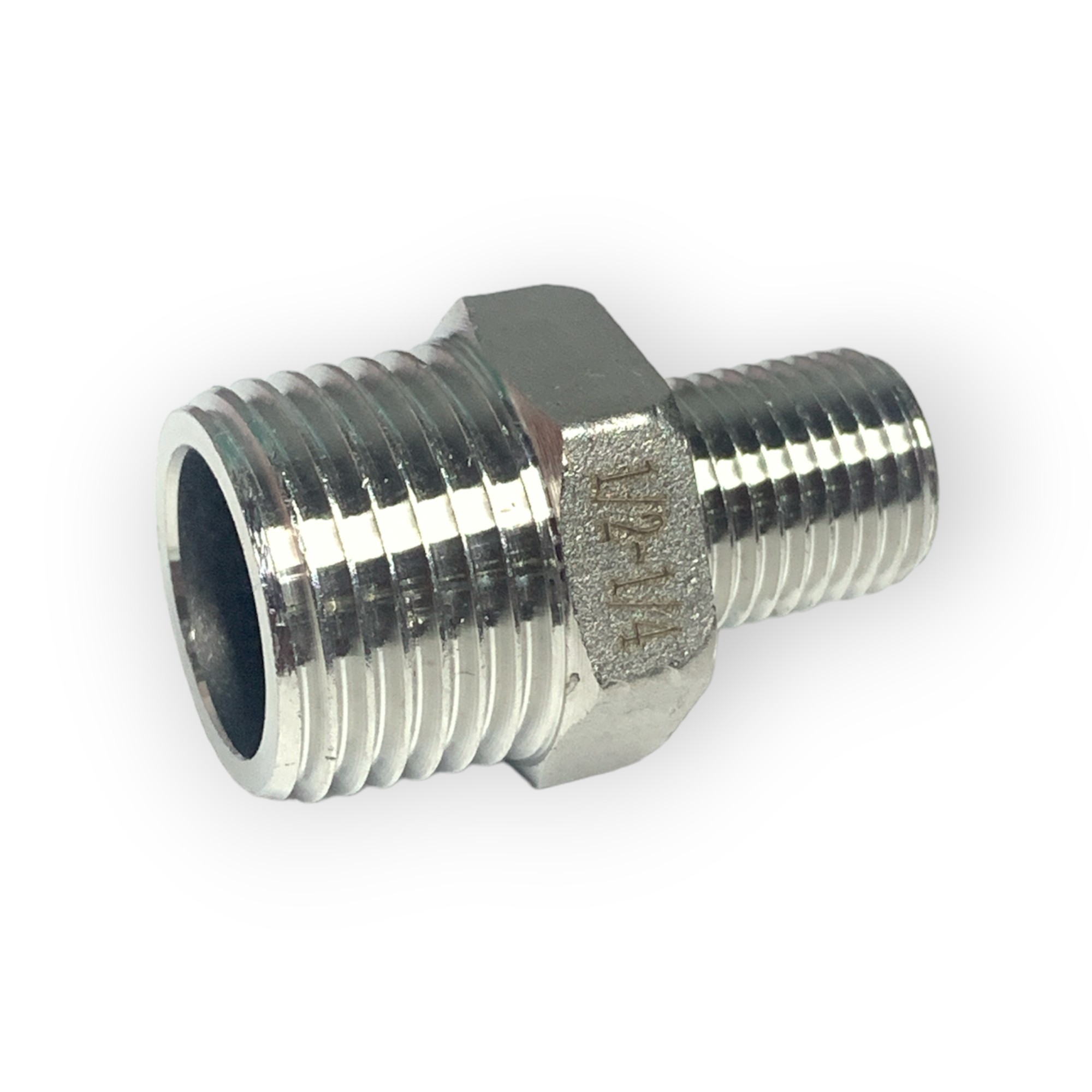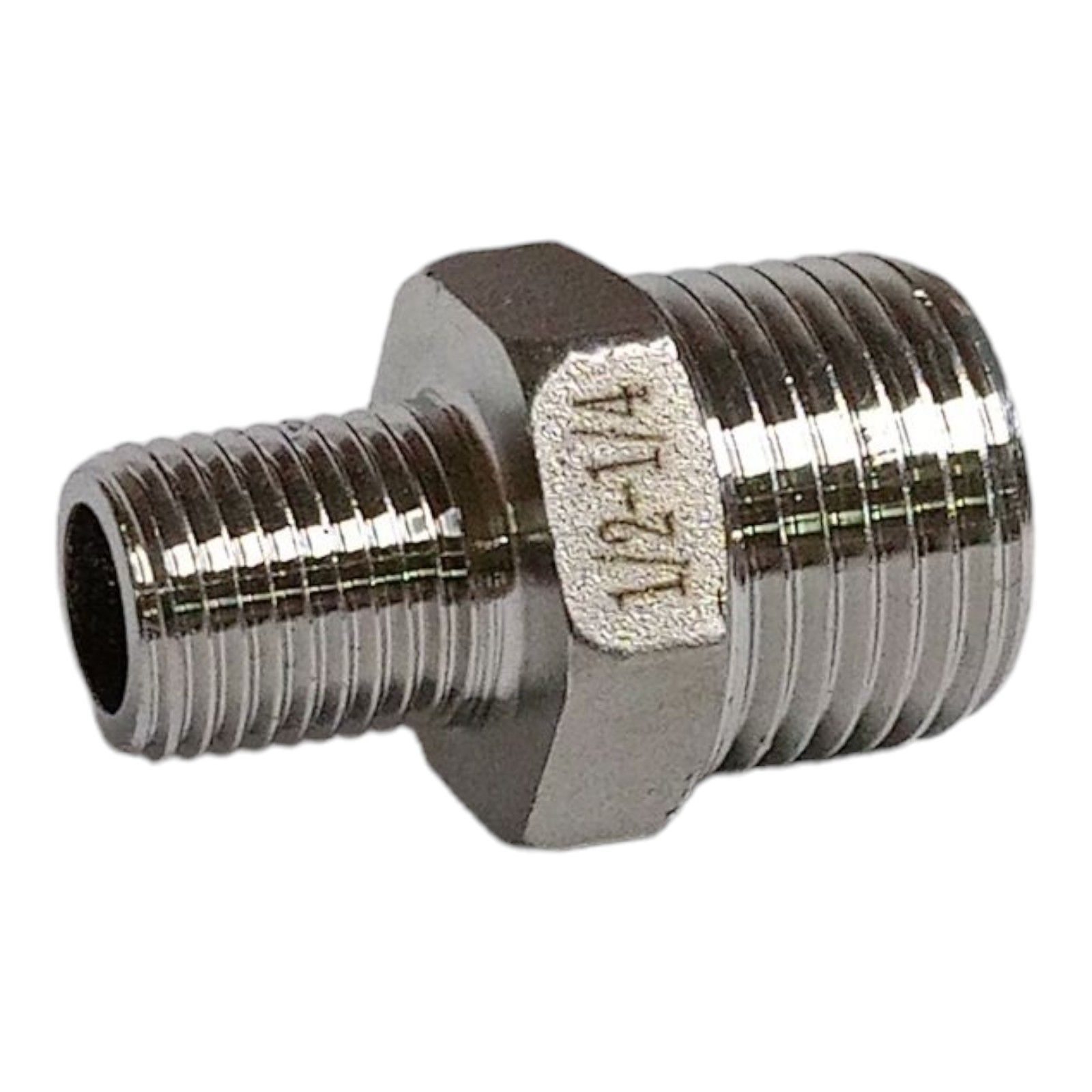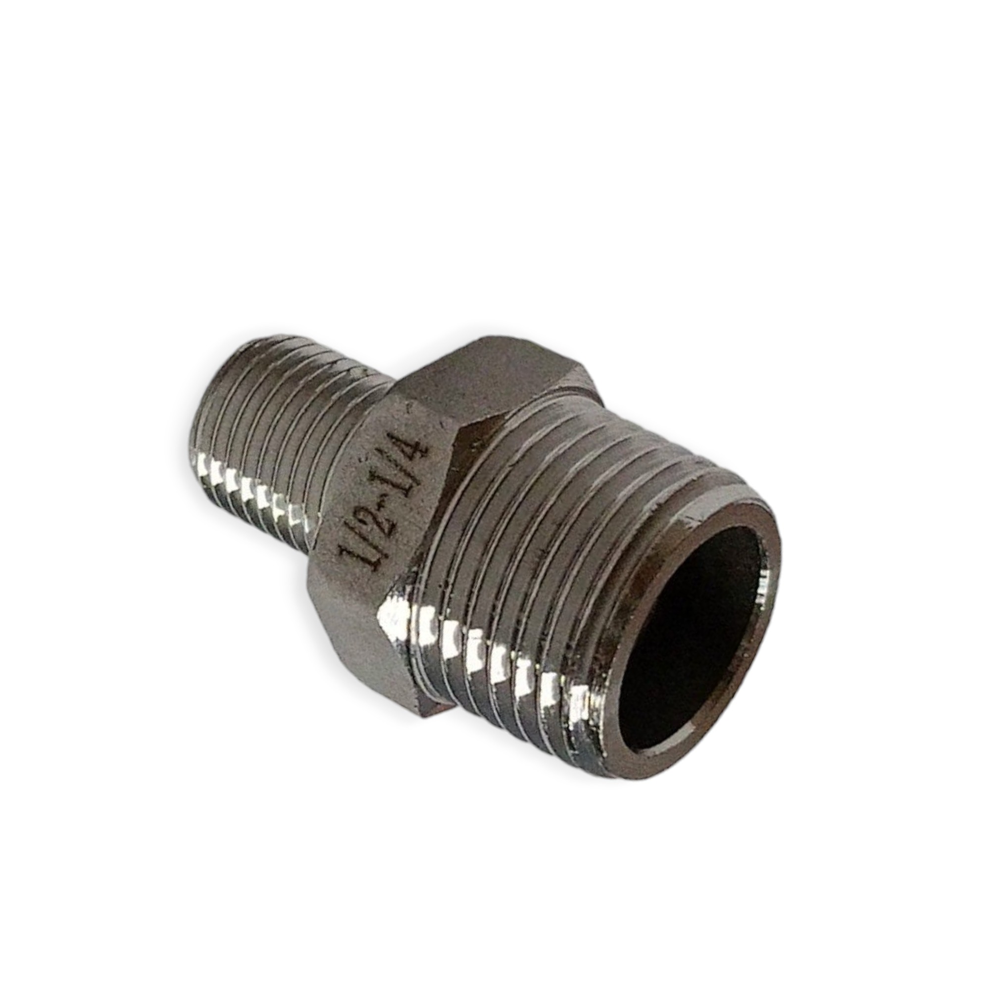 Ниппель имеет разную резьбу на концах. С одной стороны - наружная резьба 1/2", с другой стороны наружная резьба 1/4"